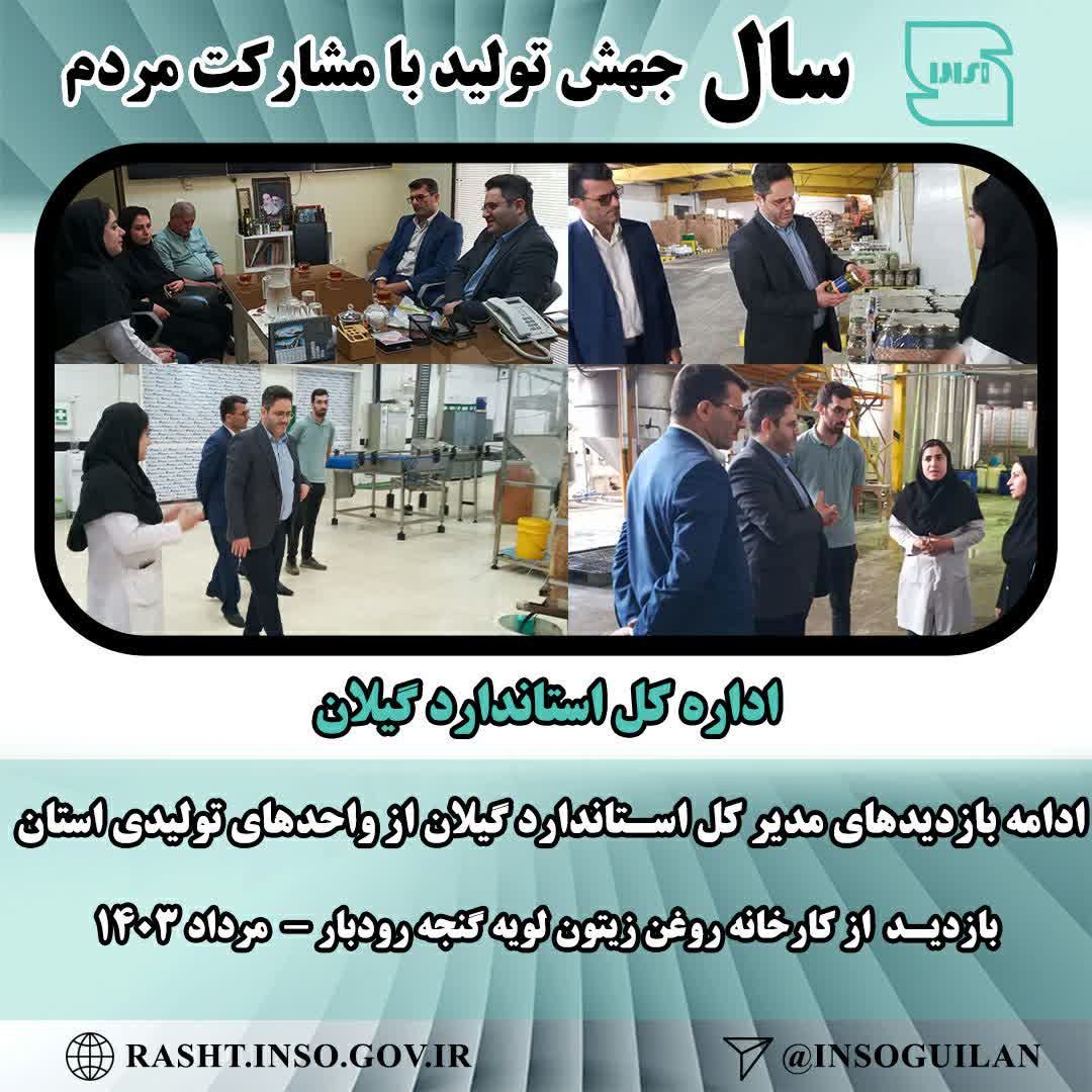 به گزارش زرجوب نیوز به نقل از روابط عمومی اداره کل استاندارد گیلان، در راستای پایش عملکرد و رفع مشکلات واحدهای تولیدی و همچنین با هدف نظارت بر روند انجام امور محوله در ادارات شهرستانی، مدیر کل استاندارد استان پس از حضور در اداره استاندارد شهرستان رودبار با هماهنگی و همراهی رئیس این اداره از واحدهای تولیدی روغن زیتون لویه رودبار و سیمان خزر و روغن موتور ملت لوشان بازدید کرد.
