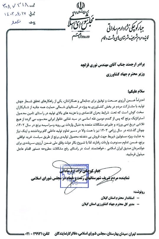 زرجوب نیوز _مهندس کوچکی نژاد نماینده مردم شهرستانهای رشت و خمام در مجلس شورای اسلامی فرمودند: یکی از راهکارهای تحقق شعار جهش تولید با مشارکت مردم در بخش کشاورزی به ویژه در استانهای شمالی حمایت همه جانبه از شالیکاران سخت کوش است که تحت شرایط بحران اقتصادی وبا هزینه های بالای تولید در راستای تامین محصول استراتژیک برنج که پس از گندم دومین غله اساسی در سبد غذایی خانوار ایرانی محسوب می گردد همچنان در جهت حفظ این محصول در استان با مشکلات زیادی روبرو هستند.