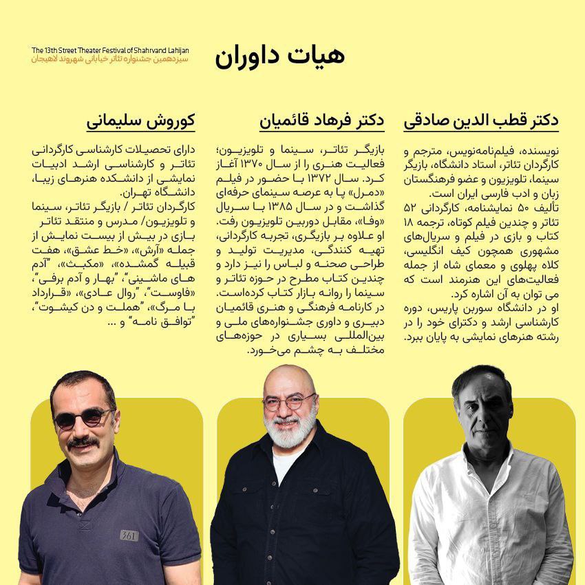 هیات داوران بخش کودک و اصلی سیزدهمین جشنواره تئاتر خیابانی شهروند لاهیجان طی احکامی از سوی دبیر جشنواره معرفی شدند.