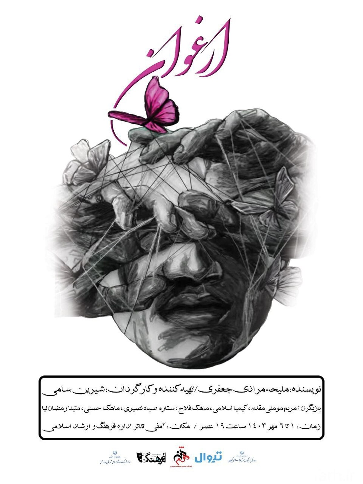 کارگردان نمایش ارغوان عنوان کرد : ” ارغوان ” در ساعت ۱۹ یکم لغایت ۶ مهر در سالن آمفی تئاتر اداره فرهنگ و ارشاد اسلامی بندرانزلی به روی صحنه می رود و حامی مالی نمایش موسسه استعدادیابی نیک می باشد و خرید بليط از سایت تیوال