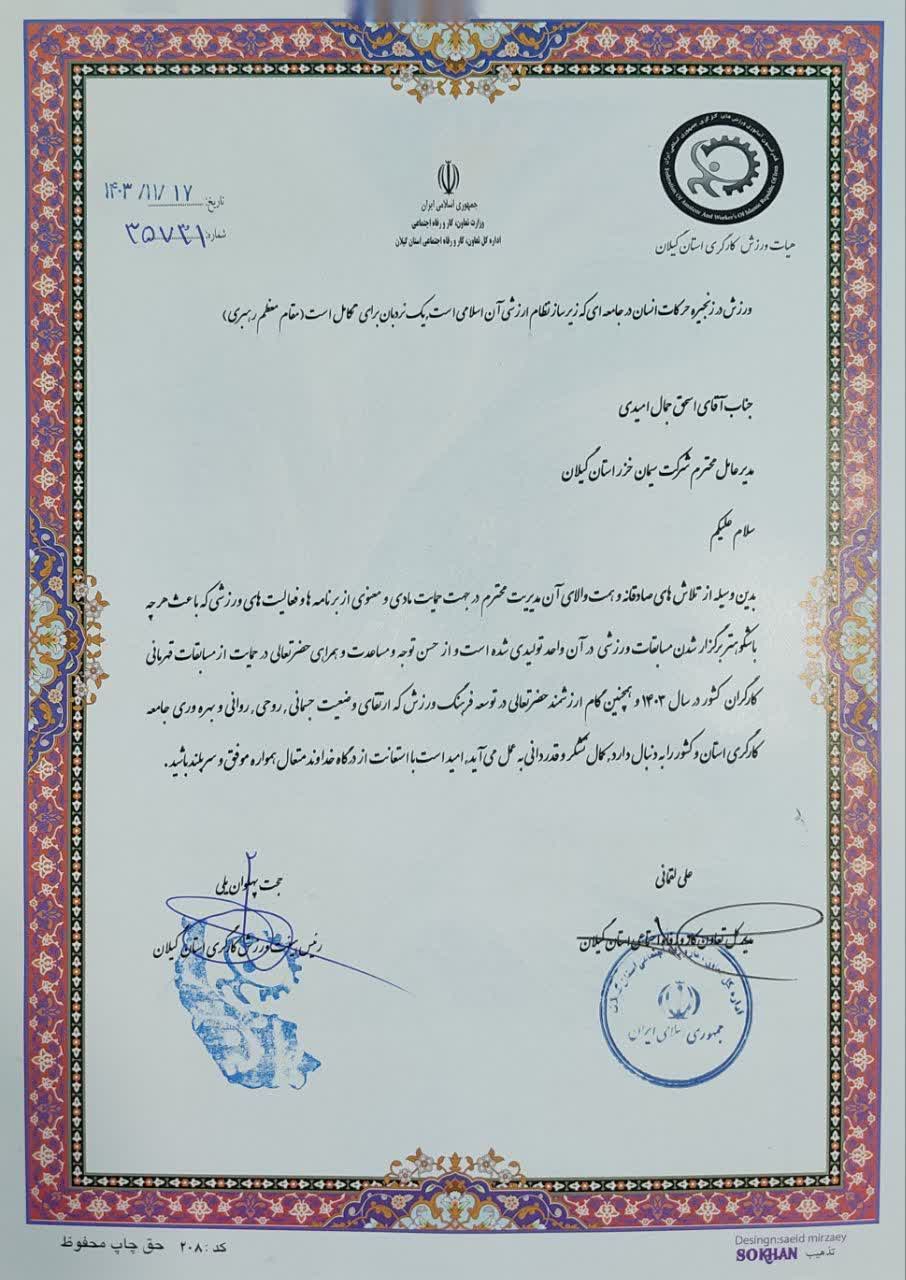 زرجوب نیوز _در مراسمی که به مناسبت دهه فجر و به همت اداره کل تعاون، کار و رفاه اجتماعی برگزار شد، از دکتر اسحق جمال امیدی مدیر عامل و نایب رئیس هیئت مدیره شرکت سیمان خزر ، به دلیل حمایت مادی و معنوی از تیم های ورزشی استان گیلان در سطوح مختلف مسابقات کارگری کشور به عنوان واحد تولیدی برتر حامی ورزش کارگری با حضور مدیران استانی تقدیر به عمل آمد.