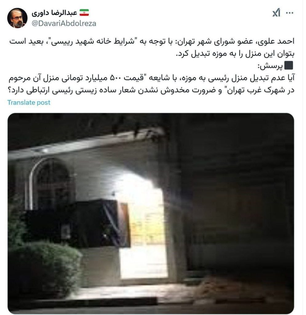 به گزارش زرجوب نیور ” به نقل از ” فارس ” ، رئیس کمیته گردشگری شورای شهر احمد علوی ضمن رد این خبر می گوید که «قیمت خانه رئیس جمهور شهید به گرد پای ارقامی که اعلام شده هم نمی رسد».
