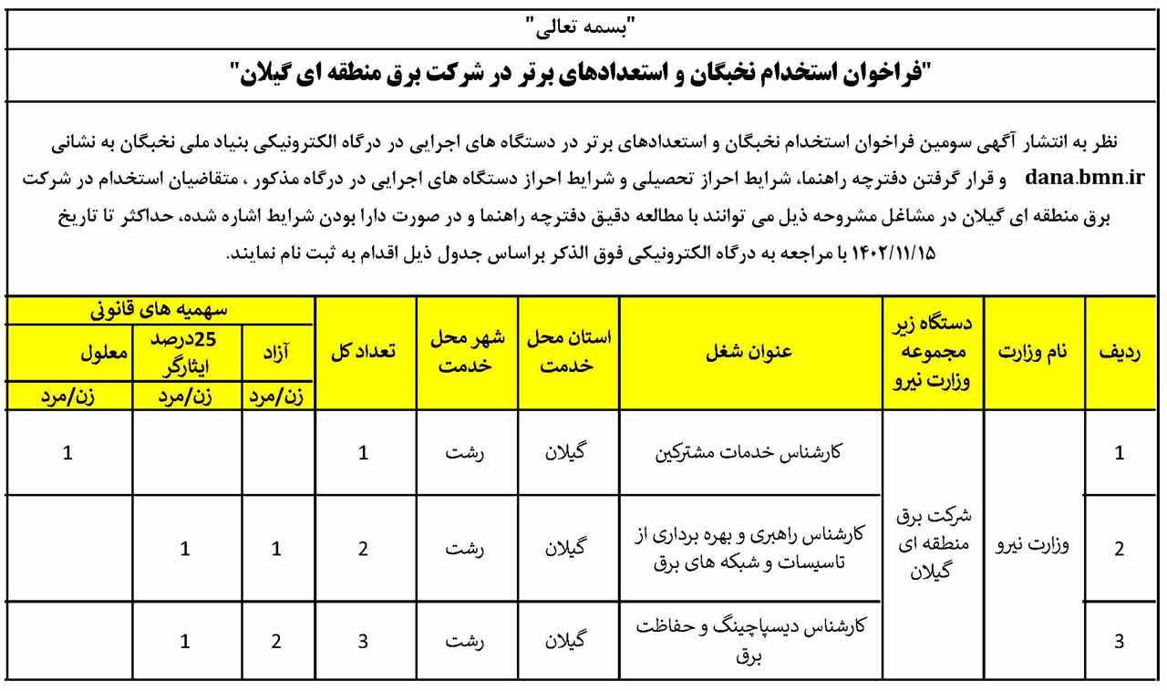نظر به انتشار آگهي سومين فراخوان استخدام نخبگان و استعدادهاي برتر در دستگاه هاي اجرايي در درگاه الكترونيكي بنياد ملي نخبگان به نشاني dana.bmn.ir و قرار گرفتن دفترچه راهنما، شرايط احراز تحصيلي و شرايط احراز دستگاه هاي اجرايي در درگاه مذكور ، متقاضيان استخدام در شركت برق منطقه اي گيلان در مشاغل مشروحه ذيل مي توانند با مطالعه دقيق دفترچه راهنما و در صورت دارا بودن شرايط اشاره شده، حداكثر تا تاريخ: