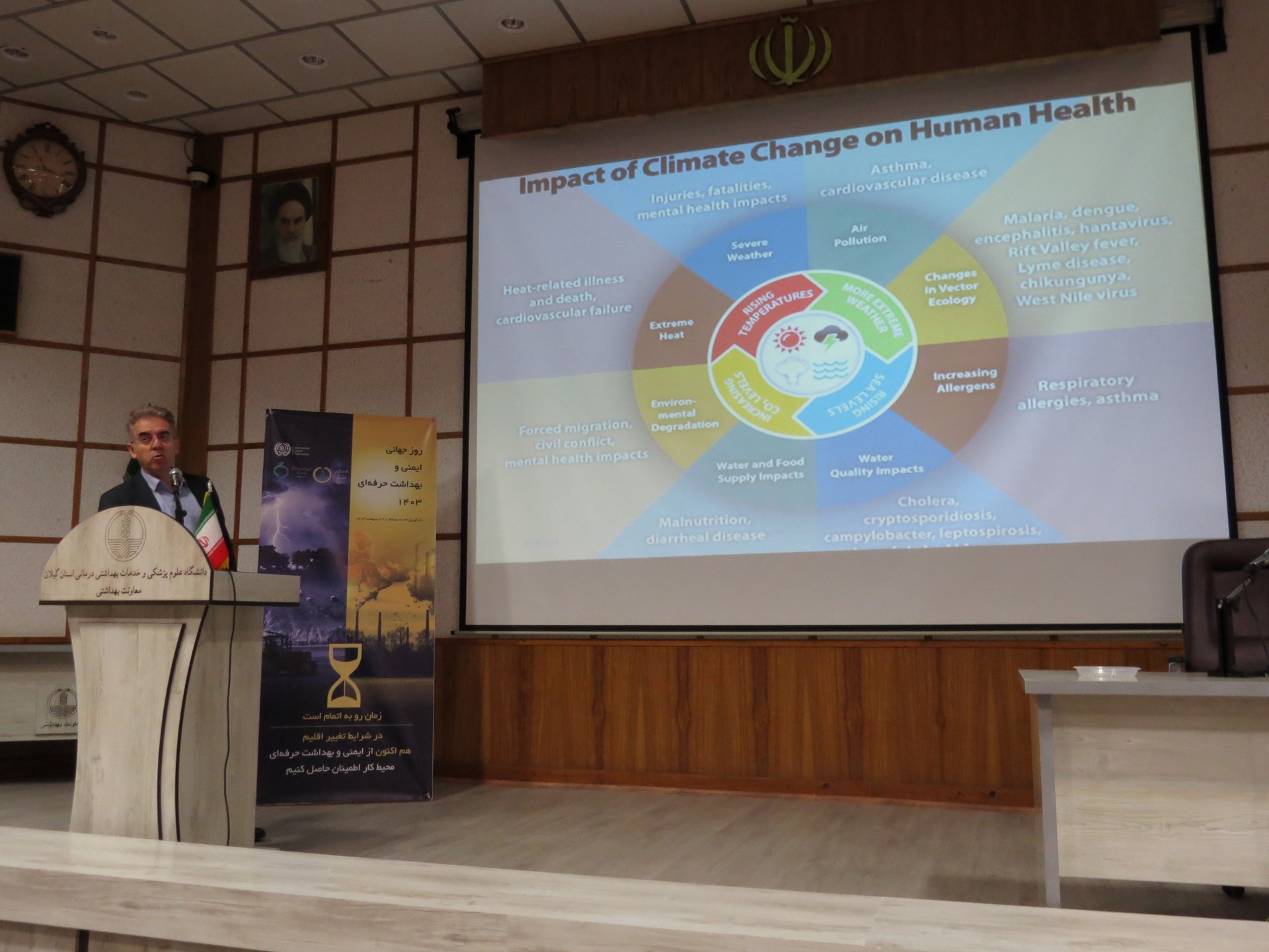 معاون بهداشتی دانشگاه ، ادامه داد ؛ تغییرات اقلیمی شامل، تغییرات درازمدت آب و هوا، بروز باران های سیل آسا، بارش های شدید و سنگین برف و آتش سوزی های وسیع بدون شک منجر به بروز بیماری های جدید، گسترش بیماری های عفونی و حتی مرگ می شود و نامگذاری روز ایمنی و بهداشت حرفه ای با تمرکز بر تغییرات اقلیمی و تاثیرات آن بر سلامت فرد و به دنبال آن سلامت جوامع و شرایط شغلی و اقتصادی، نشاندهنده اهمیت این موضوع و آگاهی بخشی در این باره است.