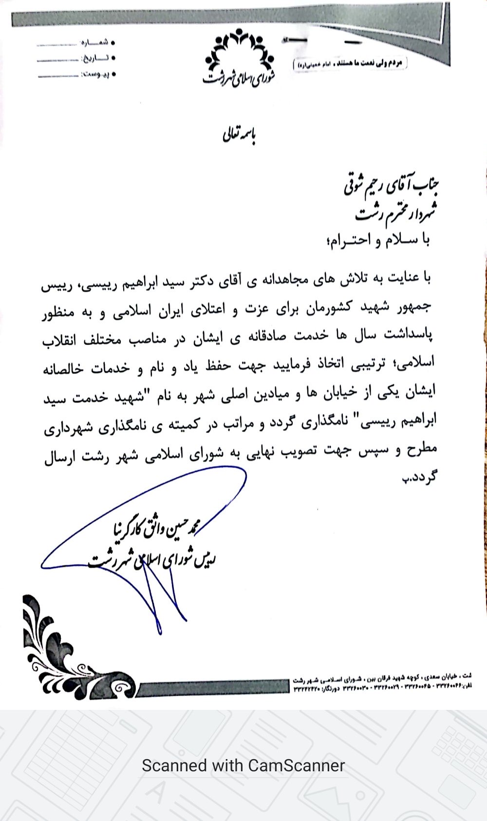 زرجوب نیوز _محمد حسین واثق کارگرنیا رئیس شورای اسلامي شهر رشت طی نامه ای خطاب به رحیم شوقی شهردار رشت ، خواستار نامگذاری یکی از خیابان ها و میادین اصلی شهر به نام رئیس جمهور شهید ، آیت الله رئیسی شد. متن نامه به شرح ذیل است.